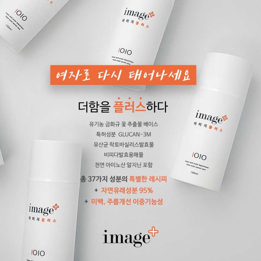 ‘이미지플러스(IMAGE PLUS)’는 유기농 금화규꽃 추출물 베이스로 유효성분을 극대화하고, 특허성분인 GLUCAN-3M, 유산균과 알지닌 등 Y존을 더 건강하게 만드는 성분들을 함유하고 있으며 자연유래성분 95%이상으로 구성되어 있습니다.